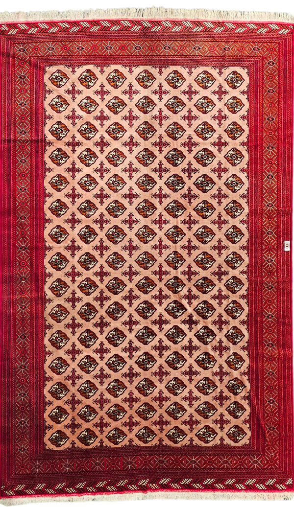 Bokhara is a term commonly used to describe Tekke-faced rugs. Tekke was a tribe from the area of Bokhara in Central Asia. The design is dominated by rows of guls and surrounding geometric patterns. The Tekke tribe is also thought to have incorporated some design aspects of the Salor tribe, also from the area of Bokhara in Central Asia. Some historians suggest that the Tekke most likely vanquished the original Salor tribe and assimilated their designs. Today “Bokhara” designed rugs are made across the carpet-weaving world, including Pakistan, Iran, India, Turkey, Afghanistan, and Central Asia.