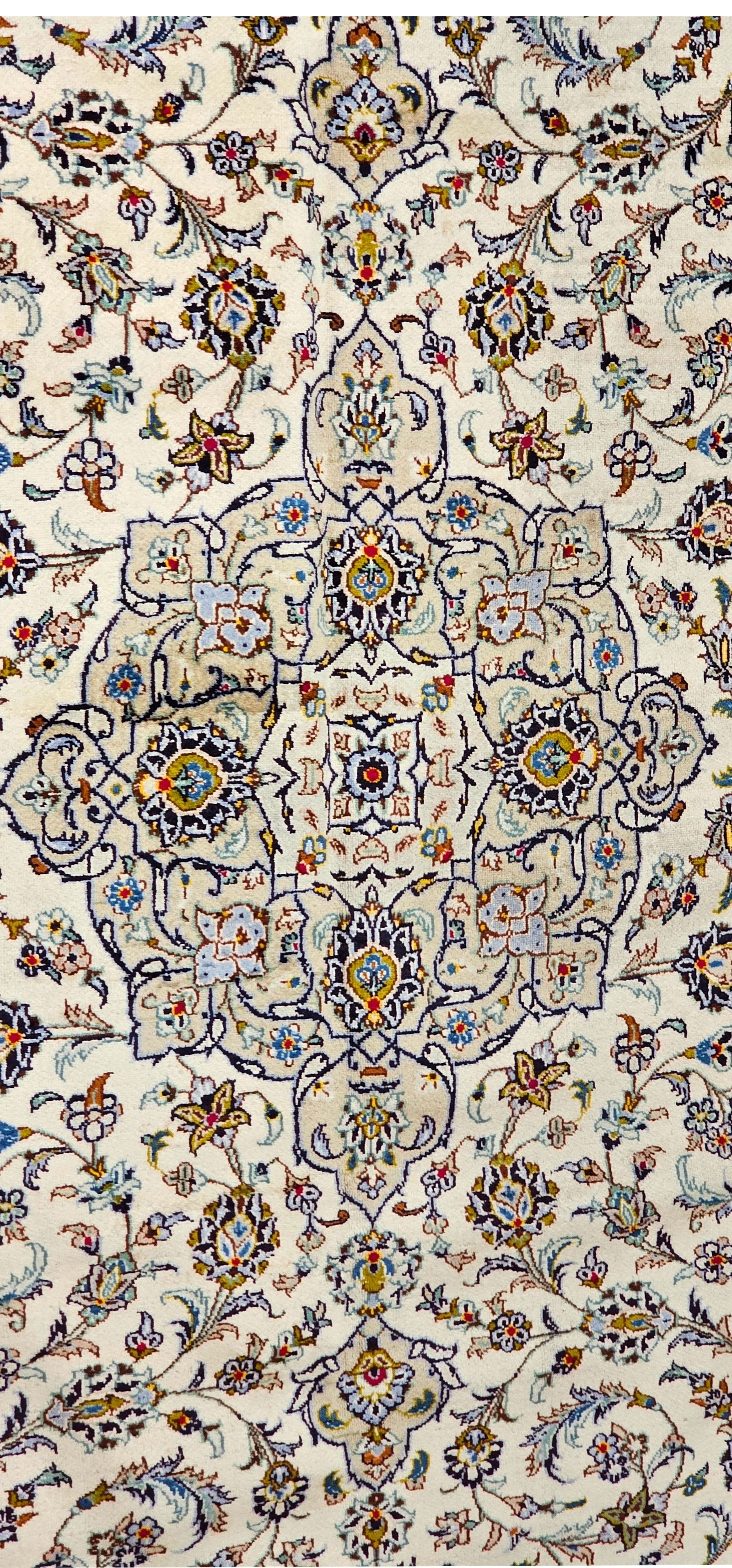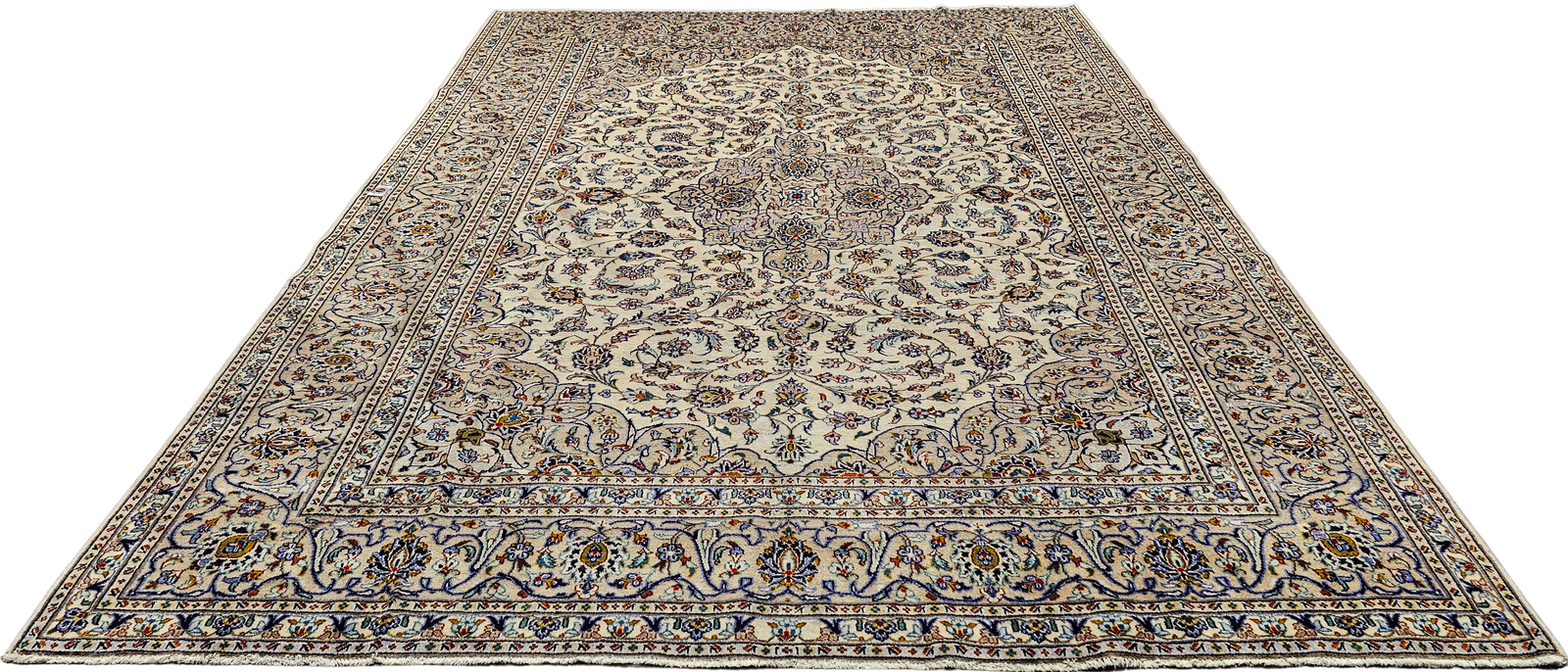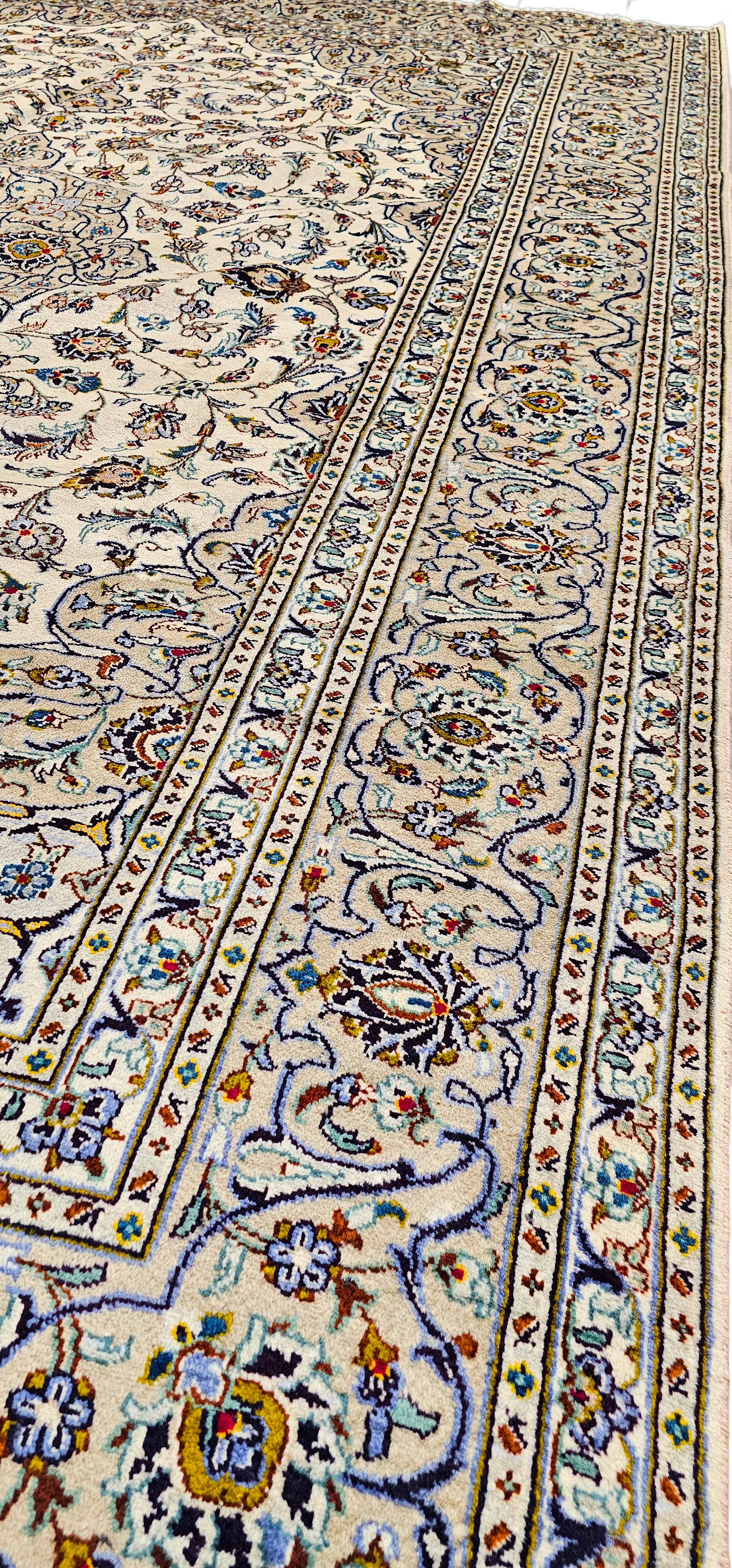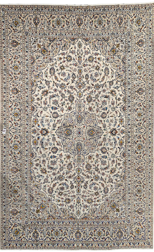 The carpets are handmade in the city of Keshan and its surroundings. Superior carpets were manufactured here during the Safavid dynasty (1502-1736). After a period of decline high quality carpets were being manufactured again at the end of the 19th century. The carpets are manufactured with high knot density with Persian knot, warp and weft of cotton and the wool for the pile is of high quality. The patterns consists of beautifully designed medallions, niches, trees and figural motifs and all-over floral motifs occur also. Dominating colours are blue, red and beige.